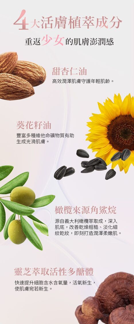 此外,PB 乳暈霜含有四大活膚植萃成分,讓你重返少女的肌膚澎潤感。甜杏仁油高效潤澤肌膚,守護年輕肌齡;葵花籽油富含多種維他命和礦物質,有助生成光滑肌膚;橄欖來源角鯊烷深入肌底,改善乾燥粗糙、淡化細紋乾紋,立即打造潤澤柔嫩肌;靈芝萃取活性多醣體快速提升細胞含水含氧量,讓肌膚宛若新生。