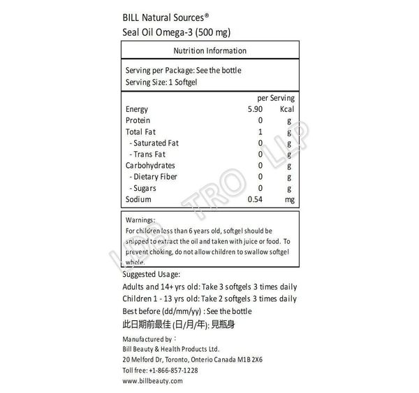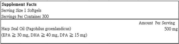 每粒軟膠囊含有: 海豹油 (Pagophilus groenlandicus 豎琴海豹) 500 毫克
