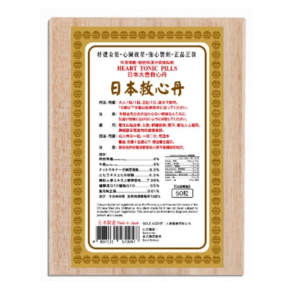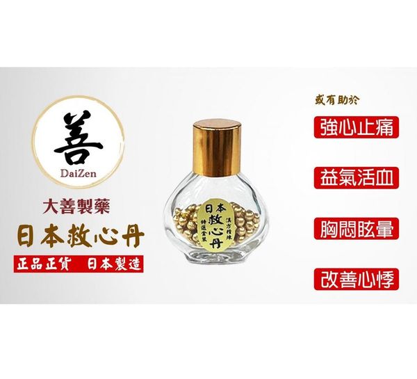 日本大善救心丹由熊膽、牛黃、納豆激酶、三七、人參、輔酶Q10、食用純金箔配製而成,有助強心寧神、益氣活血、胸悶眩暈、改善心悸、疲乏無力。