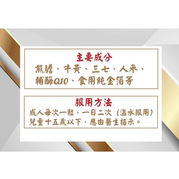 熊膽、牛黃、納豆激酶、三七、人參、輔酶Q10、食用純金箔
