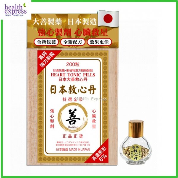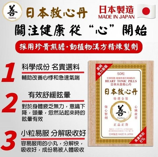 日本大善救心丹由熊膽、牛黃、納豆激酶、三七、人參、輔酶Q10、食用純金箔配製而成,有助強心寧神、益氣活血、胸悶眩暈、改善心悸、疲乏無力。