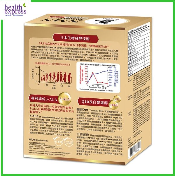 DaiZen 逆齡抗衰老護心NMN 20000 PLUS+ 採用專利配方,添加了 5-ALA(5-氨基乙酰磷酸磷酸鹽)、輔酶 Q10 和白藜蘆醇。 5-ALA 是人體必需的氨基酸。 5-ALA除了增強免疫力外,還可以幫助放鬆、美夢和改善睡眠質量。 另一種添加元素輔酶 Q10有助能量產生及減緩老化,提供抗氧化劑來對抗自由基並有助抗衰老。 CoQ10可以幫助增加耐力,減少疲勞。 白藜蘆醇富含抗氧化劑,可與 NMN 適當配合,加速NAD+轉化,有助提升NAD+水平及抵抗力,從而重拾年輕。 白藜蘆醇有助延緩衰老促進新陳代謝,同時抑制黑色素形成、減退色斑、美白肌膚,減低肌膚水分流失、銷水補濕、滋潤肌膚、美肌嫩膚,達至「逆齢美肌」功效。