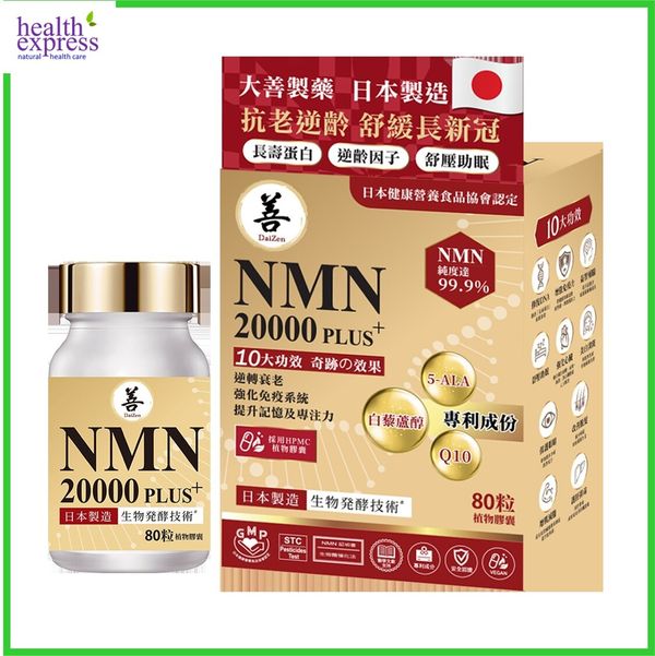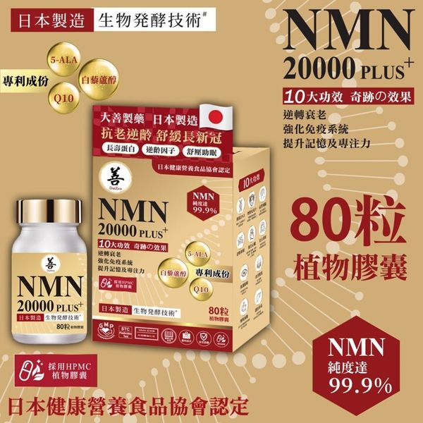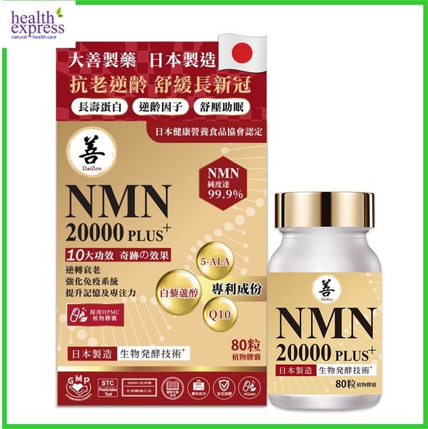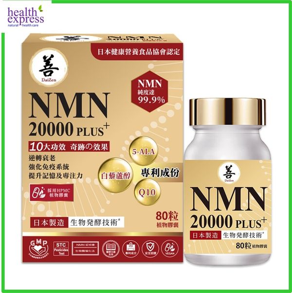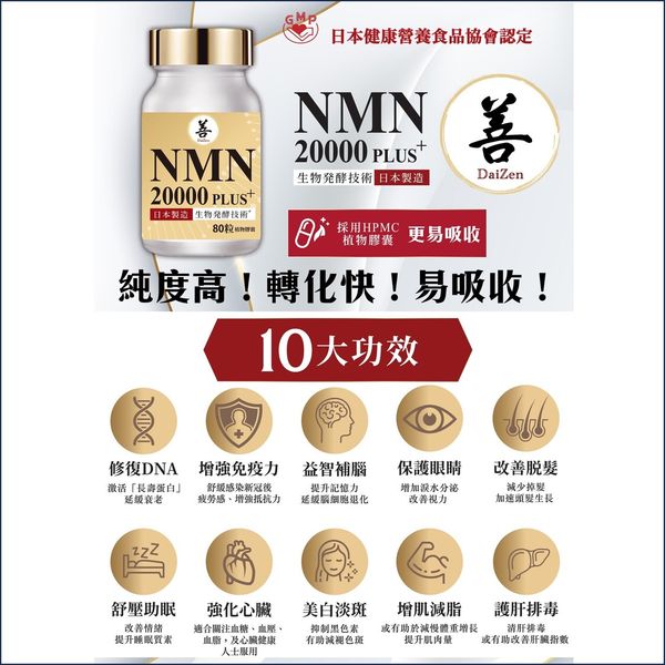 DaiZen 逆齡抗衰老護心NMN 20000 PLUS+ 採用 NMN 配方,有助抗衰老。 NMN可以直接被人體吸收並轉化為NAD+,幫助能量產生、修復細胞和日常進展。