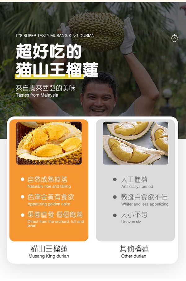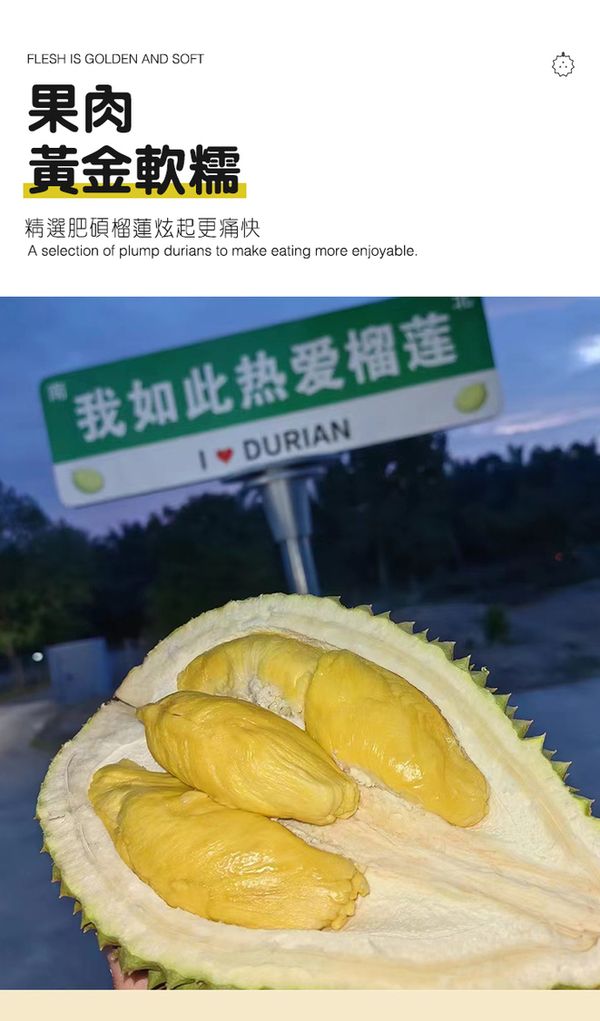 永平南利果園位於馬來西亞柔佛州,當地氣候炎熱,日照充足,降雨豐富,非常有利榴蓮樹生長,結出的果實,果肉顏色金黃引人,味道香甜濃郁,口感軟糯,細膩軟滑越吃越愛,深受大眾喜歡。其果天然樹熟,新鮮採摘,產地直發到家。10KG起訂,當天下單隔日到貨。