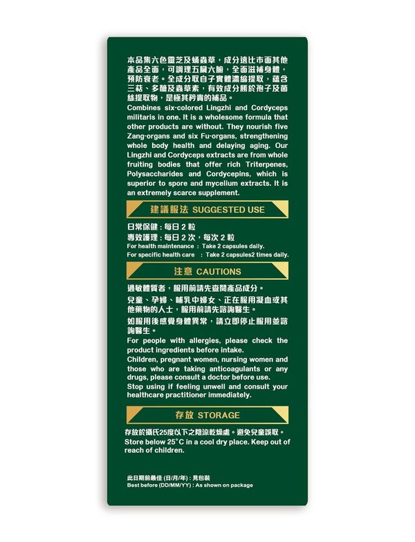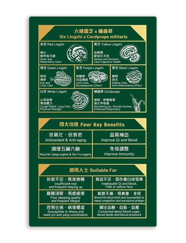本品集六色靈芝及蛹蟲草,成分遠比市面其他產品全面,可調理五臟六腑,全面滋補身體,預防衰老。