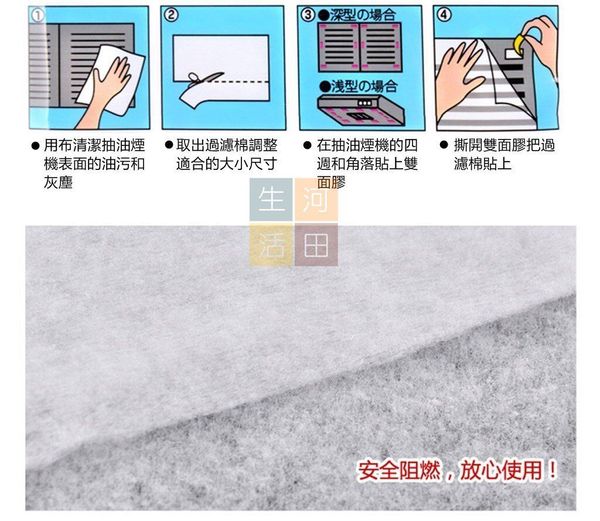 9. 材質:優質抗燃無紡布製成,耐高溫,超耐用,紮實緻密好濾油,不影響抽風,無毒,使用安全。