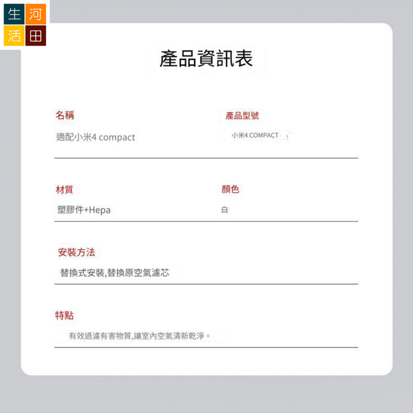 河田生活-適用於 小米 4 Compact 空氣清新機 替換用濾網(代用品)|HEPA複合顆粒活性碳濾芯|空氣淨化器過濾網