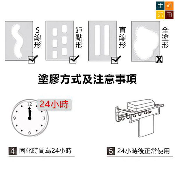 •不要擠壓過多免釘膠全塗於黏貼面,上膠保持分隔距離以發揮最牢固黏力