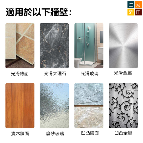•適用於以下牆壁:光滑磚面、光滑大理石、光滑玻璃、光滑金屬、實木牆面、磨砂玻璃、凹凸磚面及凹凸金屬等