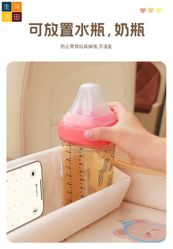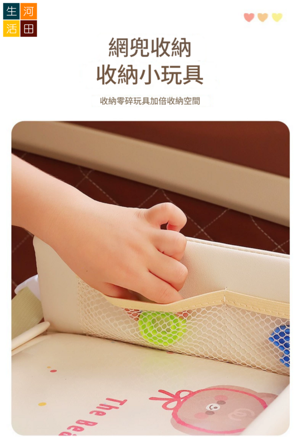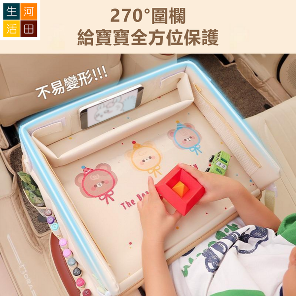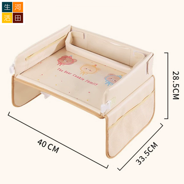 河田生活-兒童安全座椅托盤(米色熊熊) | 多功能可摺疊桌面 玩樂 置物 收納 吃飯 水杯架| 加固加厚 防水透氣 | 車內用 育兒出游好物