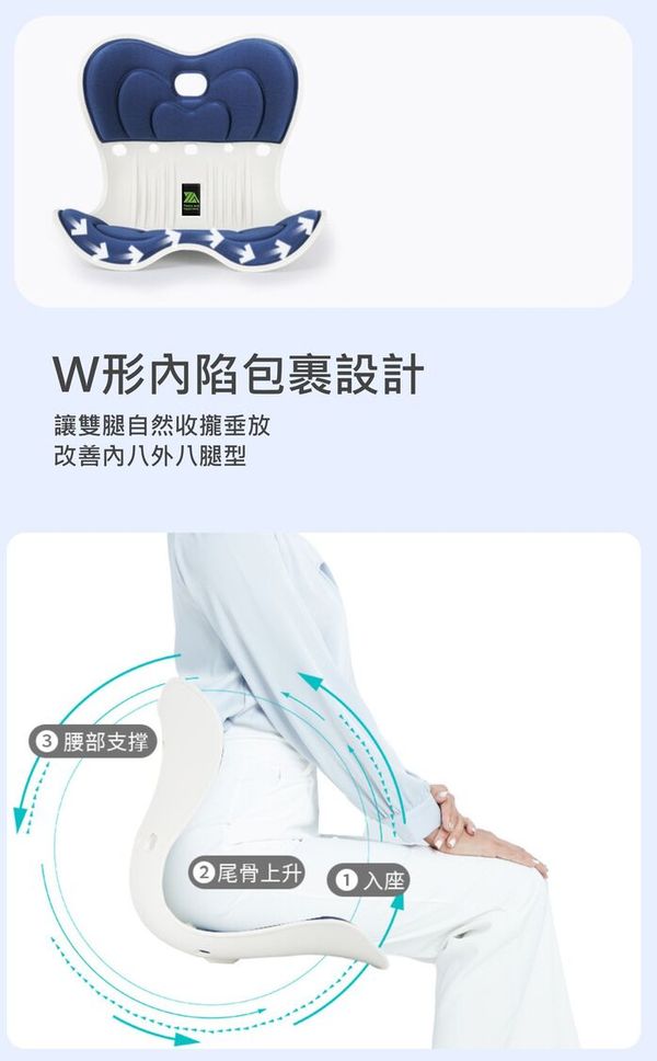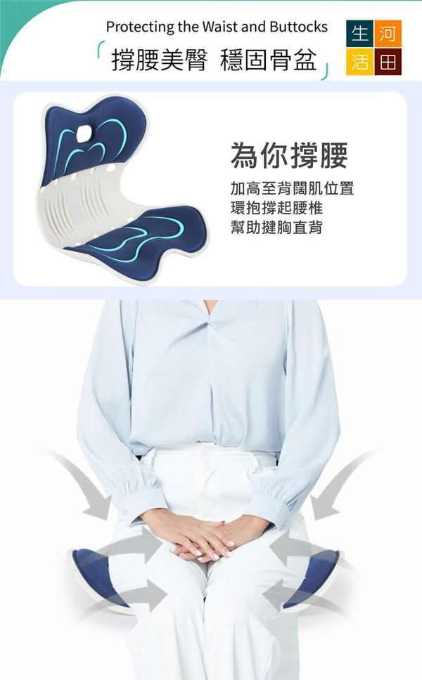 ◎ 坐墊的形狀從座位到背部都遵循身體的曲線,讓骨盆能夠站立並形成脊柱的S形曲線,從而矯正坐姿。