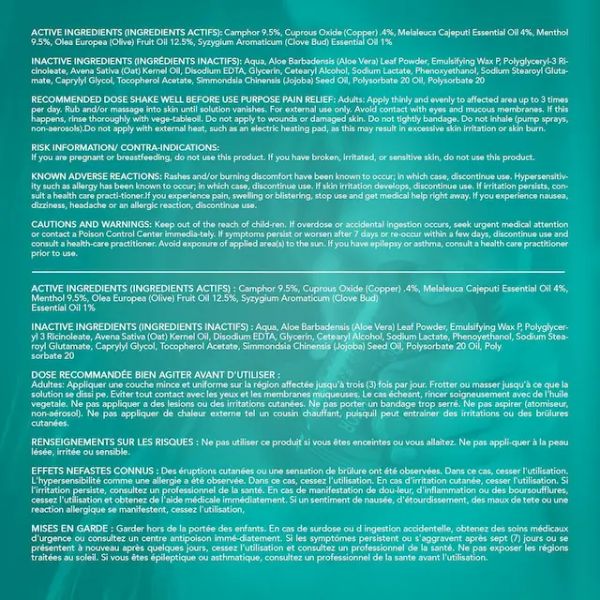切勿用於面部,僅供外用。避免兒童接觸。患有威爾遜氏病或肝功能障礙的人應在使用前諮詢醫生。 開放性傷口或眼睛。如果您懷孕或哺乳,請勿使用此產品。如果您出現皮疹、敏感或過敏反應,請立即停止使用並尋求醫療建議。避免將塗抹區域暴露於陽光下。如果您的皮膚破損、受刺激或敏感。如果您感到噁心、頭暈、頭痛或過敏反應,請停止使用。避免接觸粘膜或眼睛。請勿吸入或吞食產品。請勿塗抹於傷口或受損皮膚。請勿與外部熱源(如加熱墊)一起使用。如果您有哮喘或癲癇,在使用前請諮詢醫生。