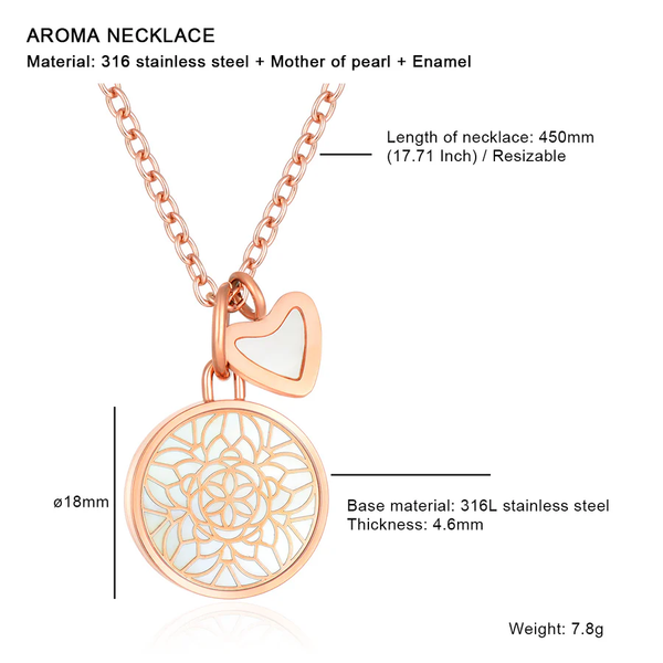 **材料選用316L不鏽鋼, 中間圓形底部天然貝母配上面層精細蓮花圖案別緻香薰吊墜, 可以隨時將個人喜愛的香薰/香水滴於鎖香石處, 讓您隨時隨地都能聞到清新氣息.