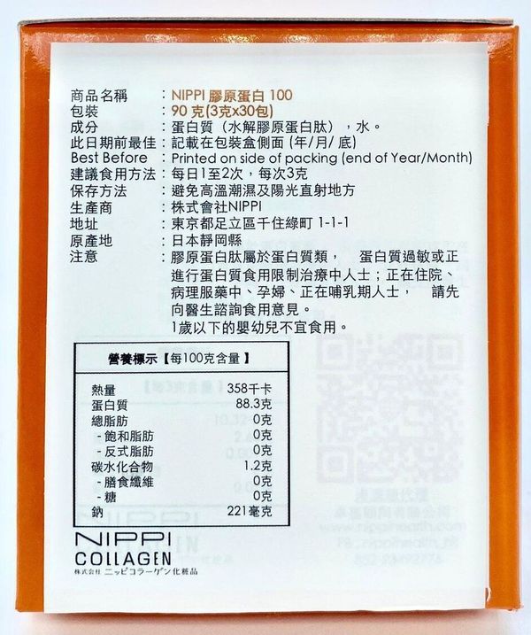 日本百年企業 Nippi 是膠原蛋白先鋒製造商,有直屬實驗室研發最新技術,原材料由美國輸入,純度高達87%,在日本擁有 ISO9001 及 GMP 認證的富士廠房生產,再由原廠直接運送香港,有品質保證。