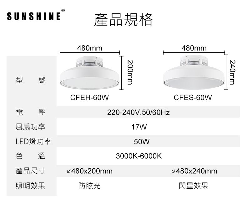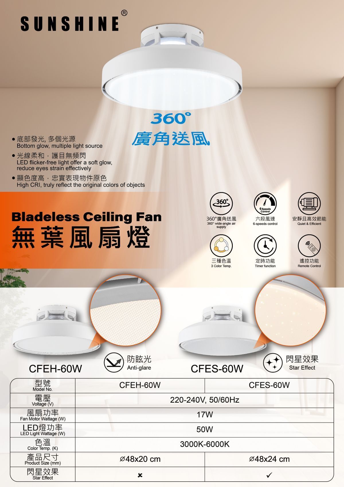 陽光-CFEH-60W (防眩光) LED遙控無葉風扇燈三色溫+可調光暗 3000K-6000K 50W 家居燈飾 天花燈 吸頂燈 電風扇 鴻運扇