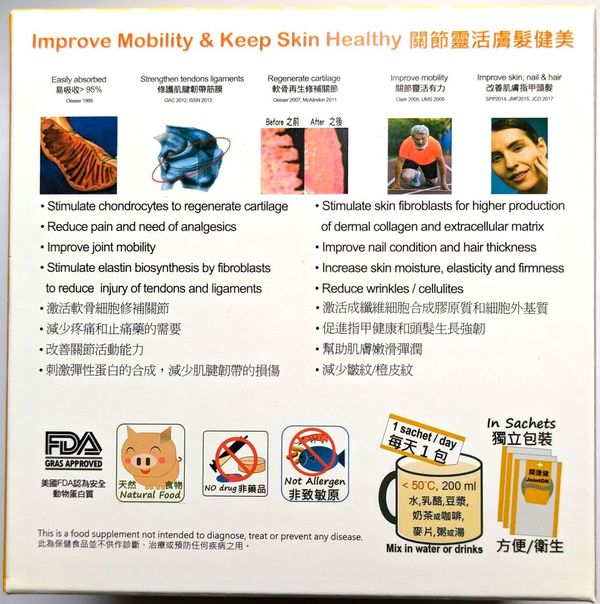 肩周痛、膝和足跟痛的人士服用,又可重建緊緻嫩肌。