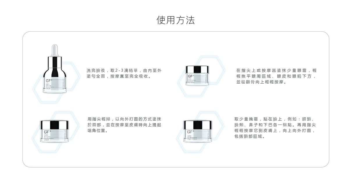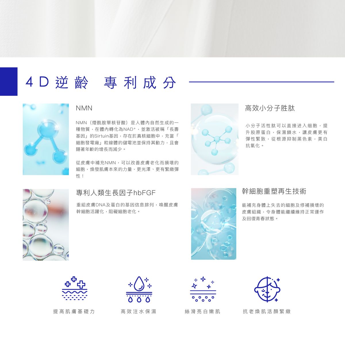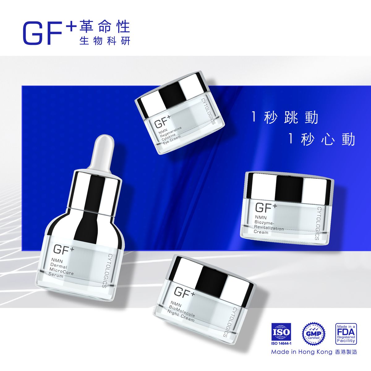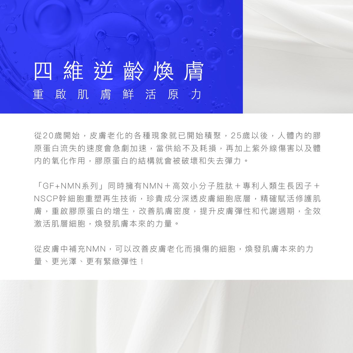 「GF+NMN系列」同時擁有NMN+高效小分子胜肽+專利人類生長因子+NSCP幹細胞重塑再生技術,珍貴成分深透