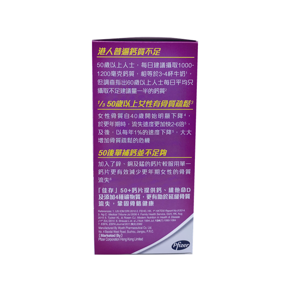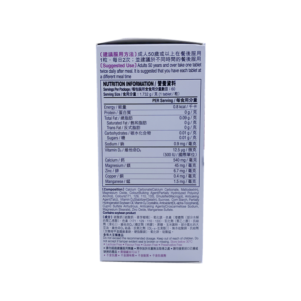 適合50歲或以上成年人士服用的鈣片,提供鈣、維他命D及4種礦物質鎂鋅銅及錳,有助延緩骨質流失,鞏固骨骼健康