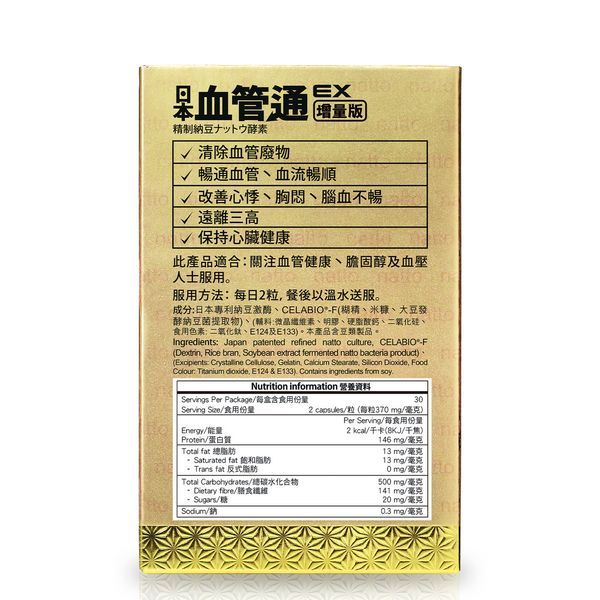 日本專利納豆激酶、CELABI0°-F(糊精、米糠、大豆發酵納豆菌提取物)、(輔料:微晶纖維素、明膠丶硬脂酸鈣、二氧化硅、食用色素:二氧化鈦、E124及E133)。本產品含豆類製品。