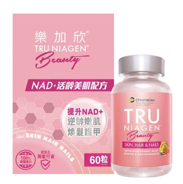 年輕美肌從此刻開始,TRU NIAGEN® BEAUTY 為全球首個加入專利成分NIAGEN®的美容保健產品,有效激活NAD+諾加因子,加速細胞修復及注入源源能量,再加入膠原蛋白(COLLAGEN)及透明質酸(HYALURONIC ACID),令肌膚充滿彈性,秀髮柔順亮澤,指甲光澤堅韌。由內至外,從根本賦活年輕。
