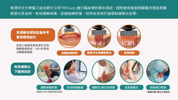 每天使用10-20分鐘,打造健康生活!臨床便利樣本測試結果顯示,使用後可以顯著改善肌骨關節症狀 (臨床便利樣本測試結果由中大醫學院聯合香港中文大學孵化的創新生物科技初創公司MTCure進行)