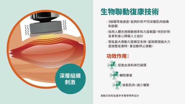 特定振動頻率刺激深層肌肉和筋膜(放鬆肌肉、減少僵硬和幫助新陳代謝)