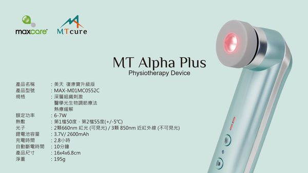 採用MTCURE BIOPHOTO光療系統,具有短波長660nm,加上長波長850nm的雙波長脈衝光生物調節功能,是一種混合調節方式。
