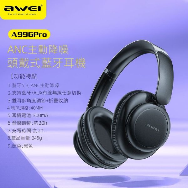 AWEI-A996Pro ANC 頭戴式耳機 可折疊 主動降噪耳機 藍牙耳機 藍牙大耳機 無線耳機 無線藍牙耳機 主動降噪 遊戲耳機 帶麥克風 環繞立體聲 電競耳機 耳罩式 無線大耳機