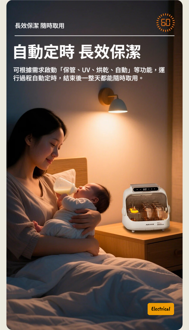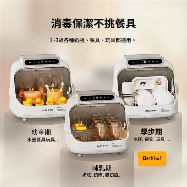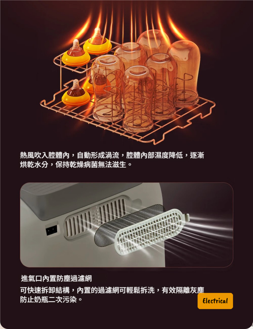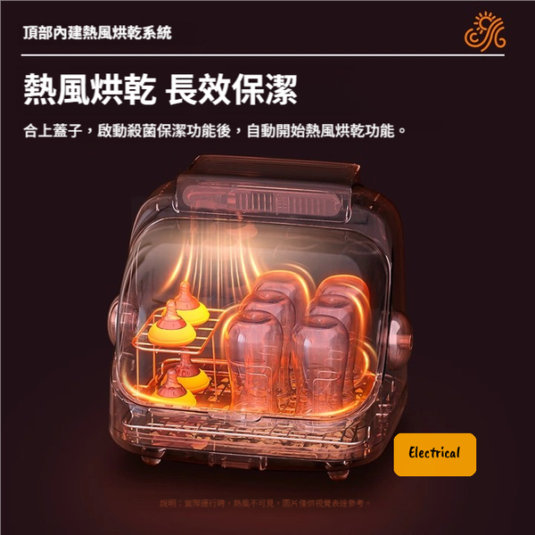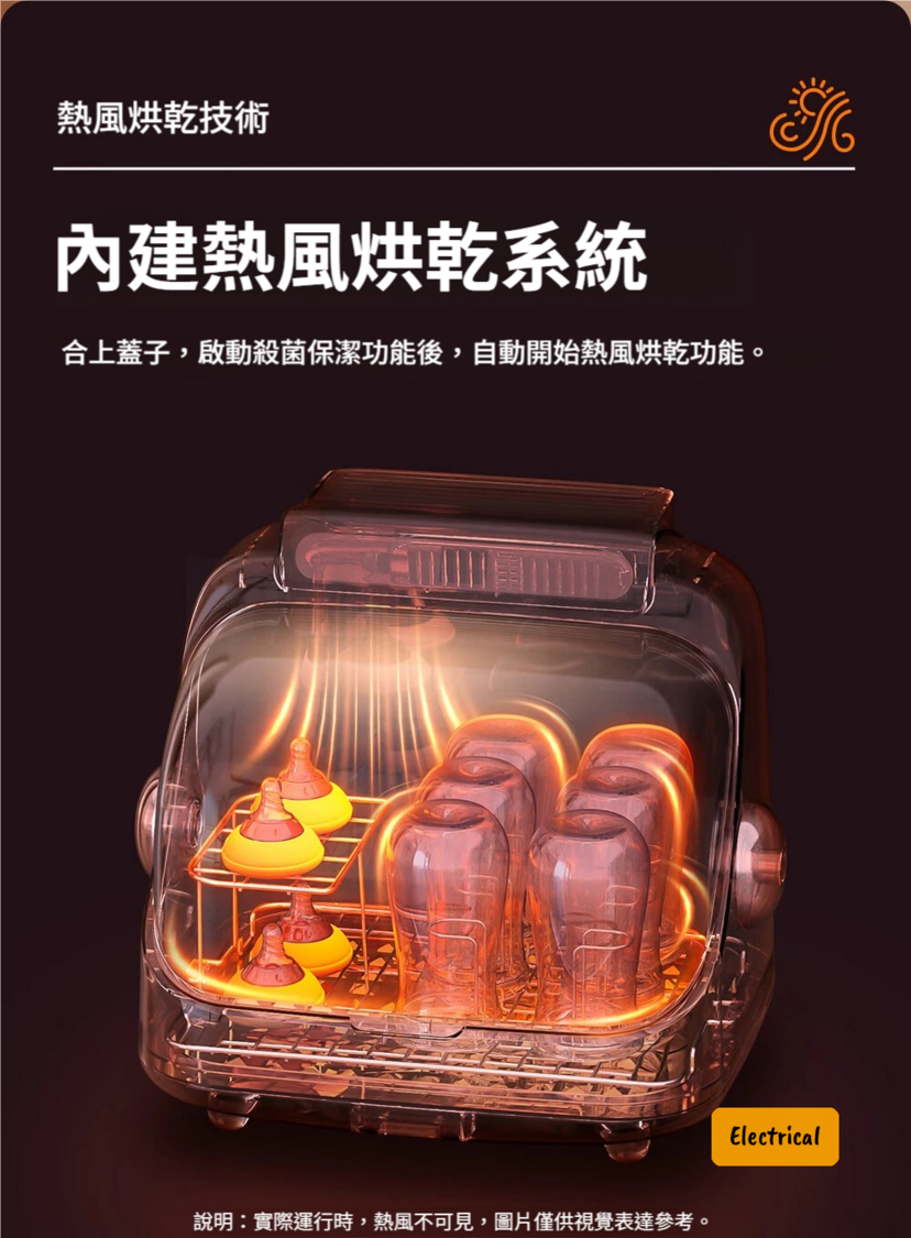 - 內置熱風烘乾系統:殺菌後自動開始烘乾,保持器具乾爽