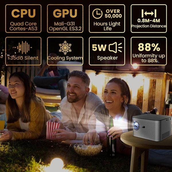 [原生 1080P & 支援 4k 投影機]:這款原生高清 1080P 投影機支援 4K 視頻,亮度高達 500ansi/10,000lm,呈現清晰、明亮、生動的高清影像效果。採用超快速WiFi6和雙向藍牙BT5.2,傳輸穩定、觀影流暢,可輕鬆連接各類藍牙音箱設備,讓您獲得沉浸式觀影體驗。