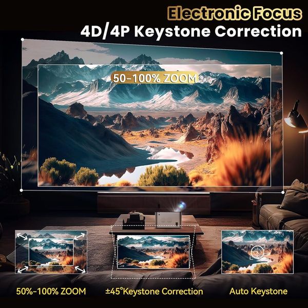[電動對焦和自動梯形校正]:這款視訊投影機具有電動對焦,一鍵遙控操作,您可以輕鬆獲得清晰的投影畫面。投影螢幕高達150英寸,噪音低於30DB,享受家庭劇院、電影之夜和決賽之夜的完美選擇!