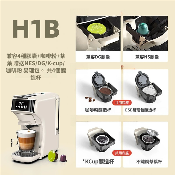 - 兼容4種膠囊(DG/NS/K-cup/NES)+咖啡粉+茶葉