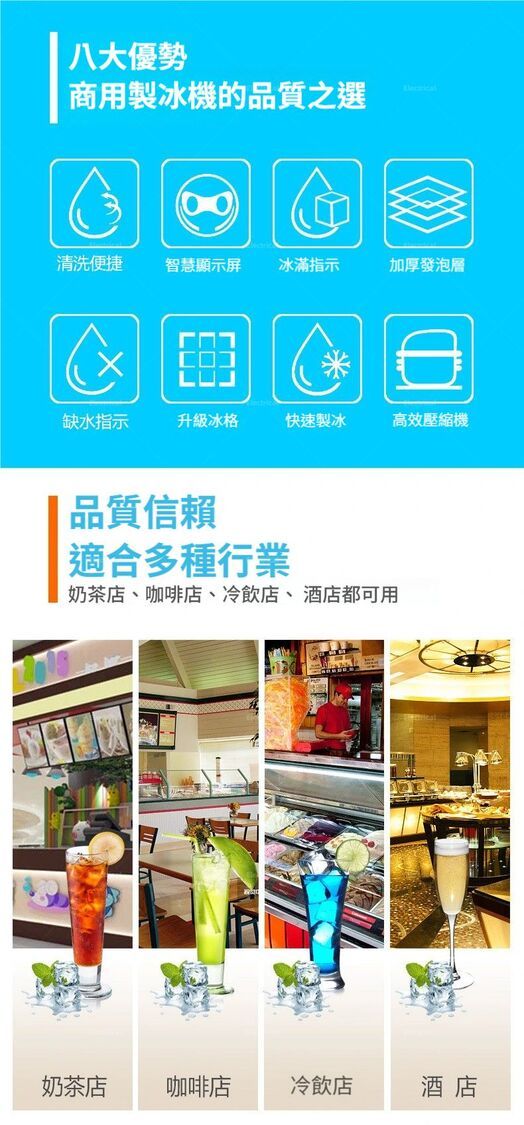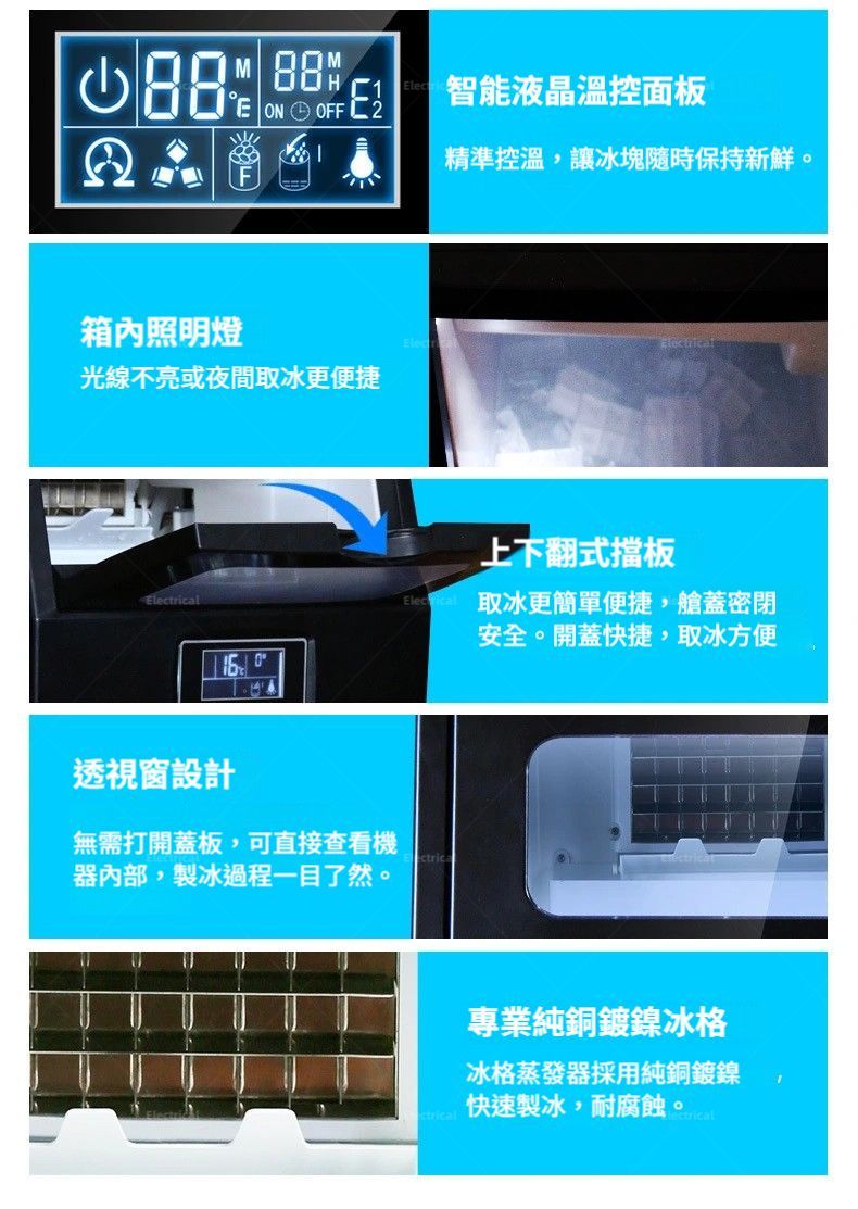 此外,該製冰機仲配備咗箱內照明燈、上下翻式擋板、透視窗設計等人性化功能,令使用更加方便舒適。無論係奶茶店、酒吧、餐飲店定係家庭使用,呢款製冰機都可以輕鬆適應,成為你生活中嘅得力助手。