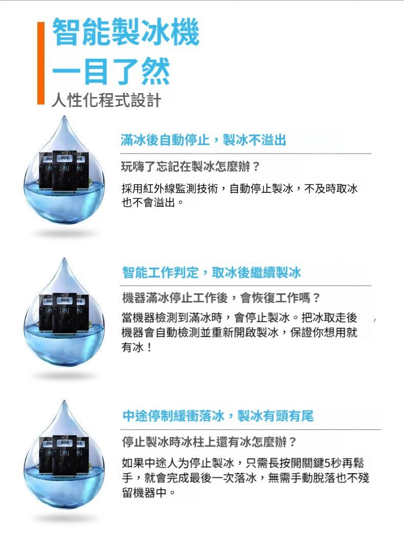 製冰機內冰塊滿後會自動停止製冰,取冰後自動製冰,避免冰塊溢出造成浪費,同時節省能源。加厚發泡層嘅採用,有效隔絕外界熱量,保持製冰機內部低溫,從而確保冰塊品質穩定。