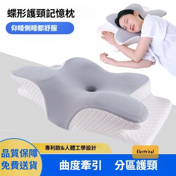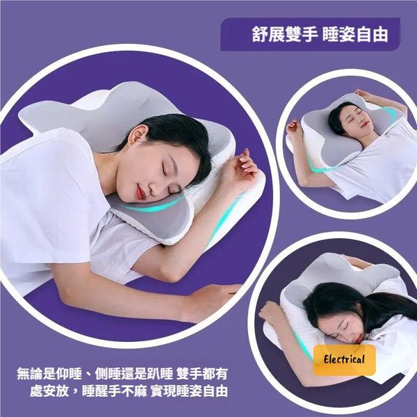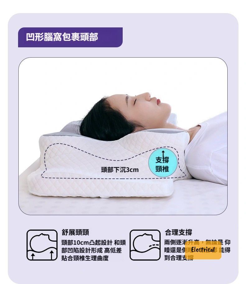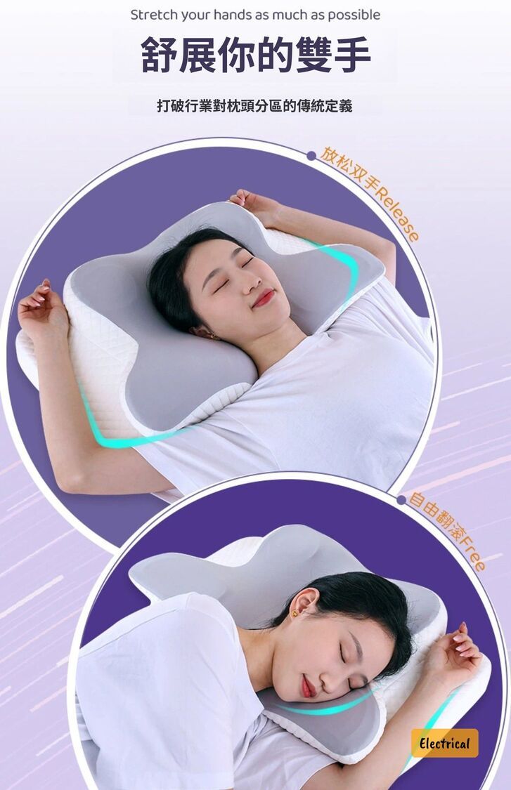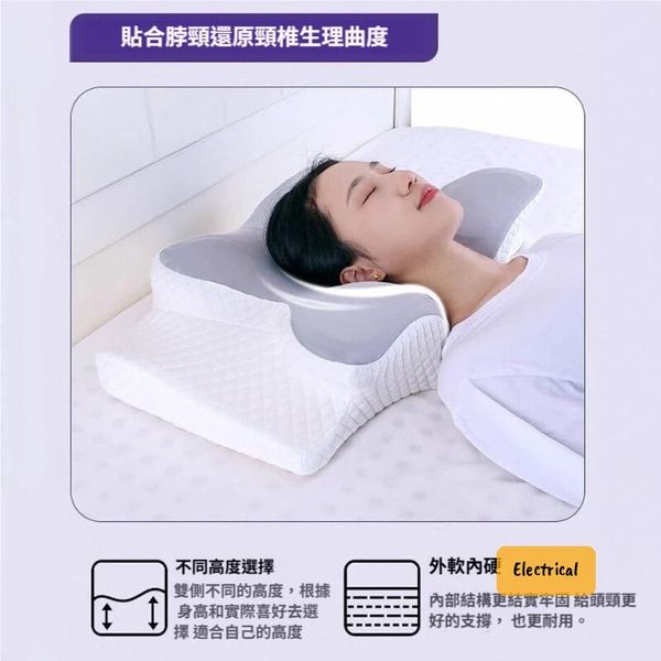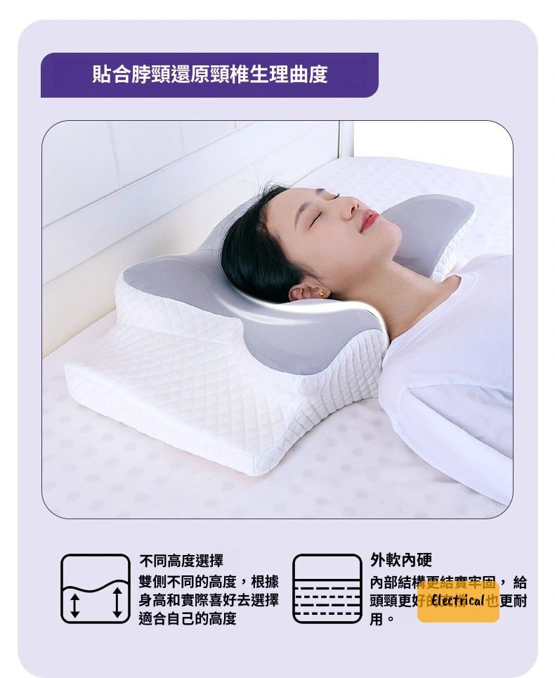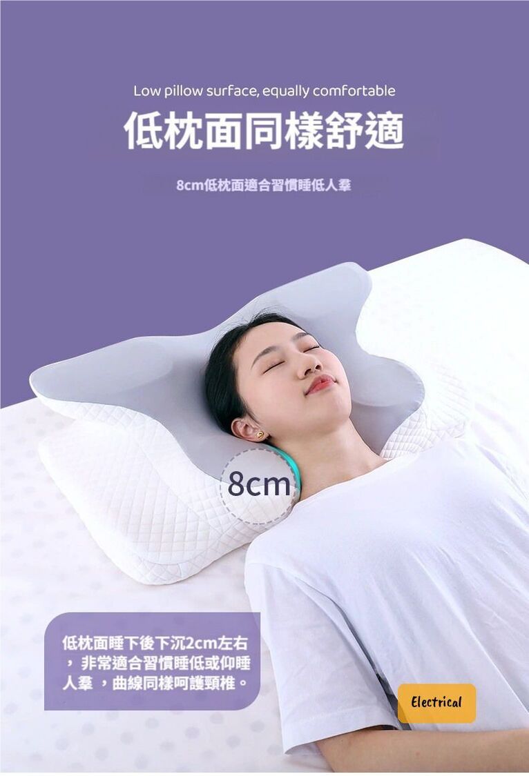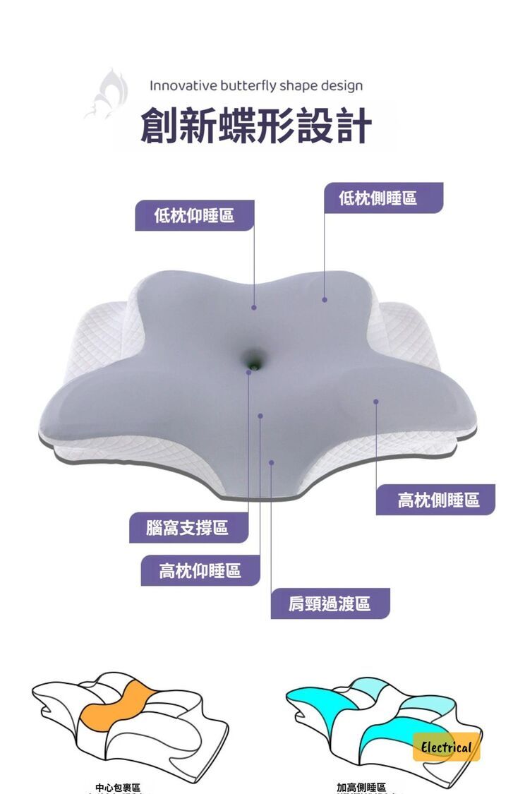 - 蝶形設計配合凹形腦窩同頸部10cm凸起,完美貼合頸椎生理曲度,提供頭頸支撐。