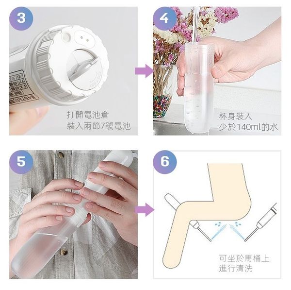如果您想在浴室秘密使用它,您可以將這款屁股清洗器放在手提包中。可日常用於旅行、幫嬰兒換尿布、清潔寵物屁股。使用方便,需要使用時即可組裝,用完後可緊湊存放。可用水量為140ml。容量足夠洗一次。