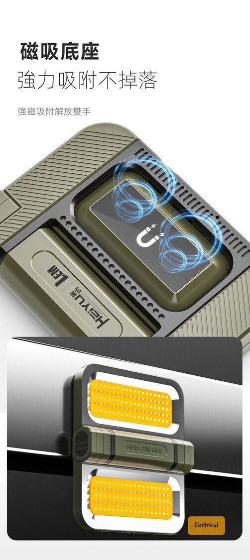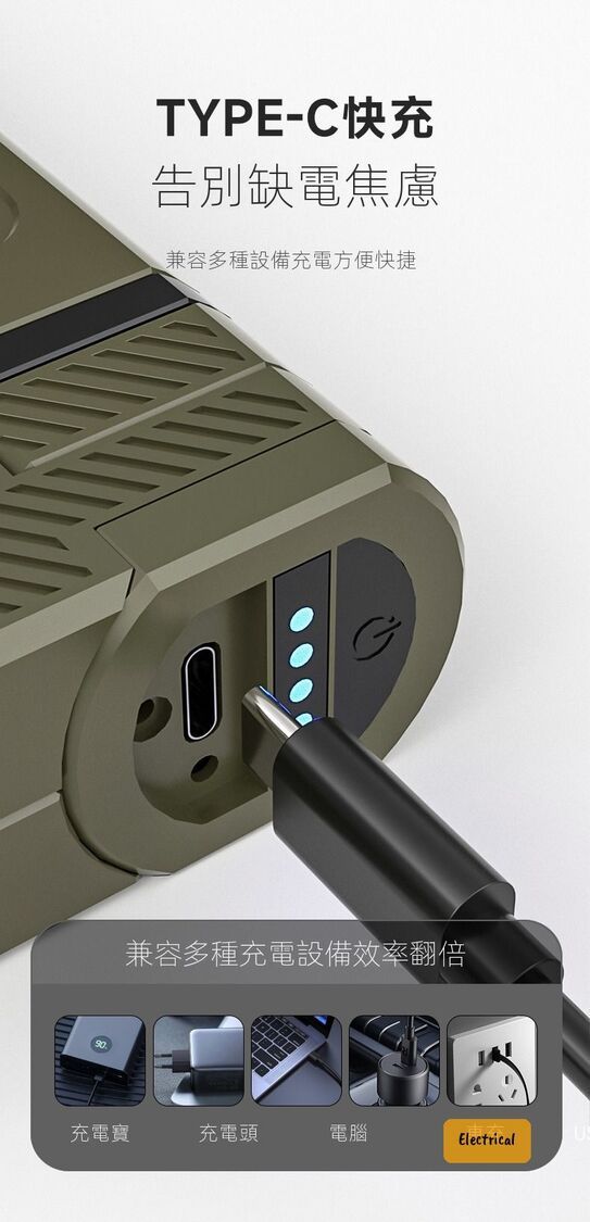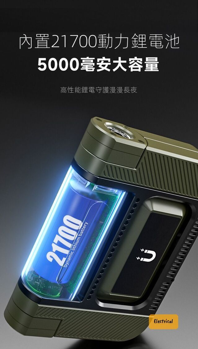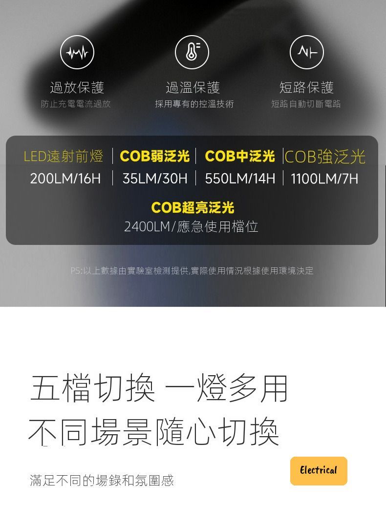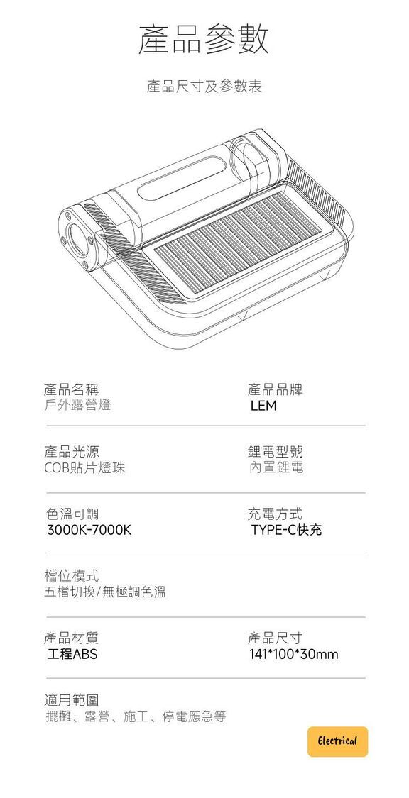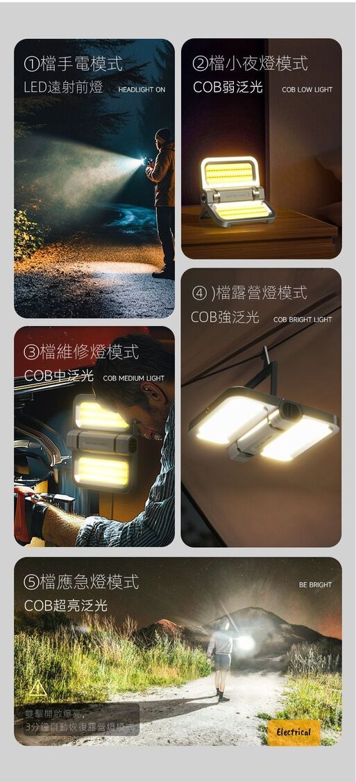 - 5大模式:電筒/營燈/維修燈/應急燈/小夜燈