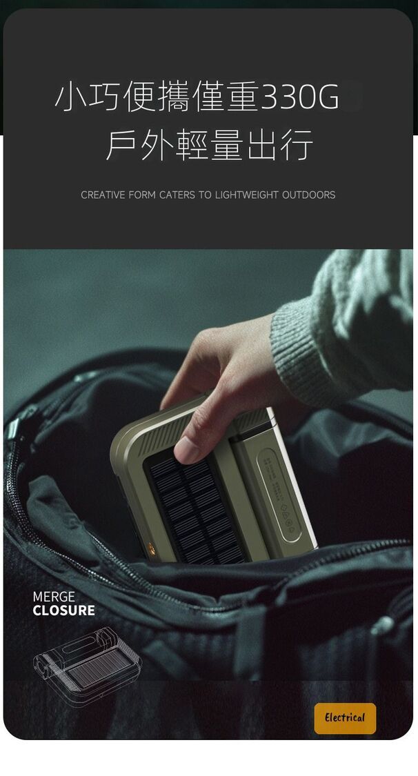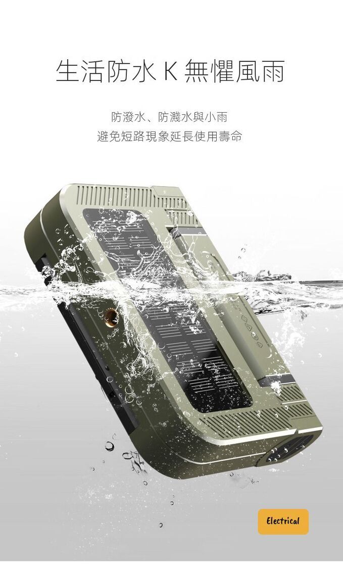 - 太陽能板(充電綠燈顯示)+USB雙充電(支援尿袋/車充)