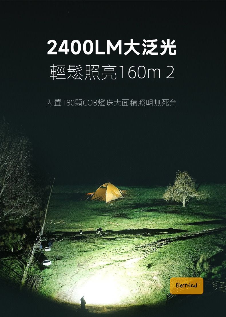- 2400流明超廣角照明,180粒COB燈珠照亮160m²範圍
