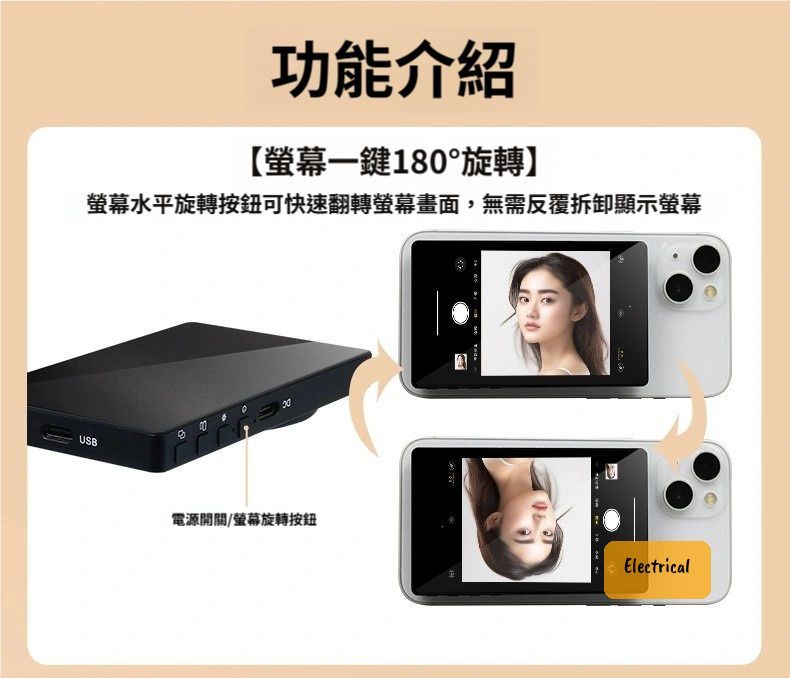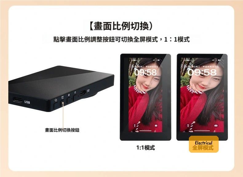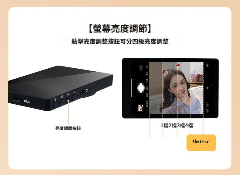 - 亮度可調4級,畫面比例可切換全屏或1:1,適應唔同拍攝環境。