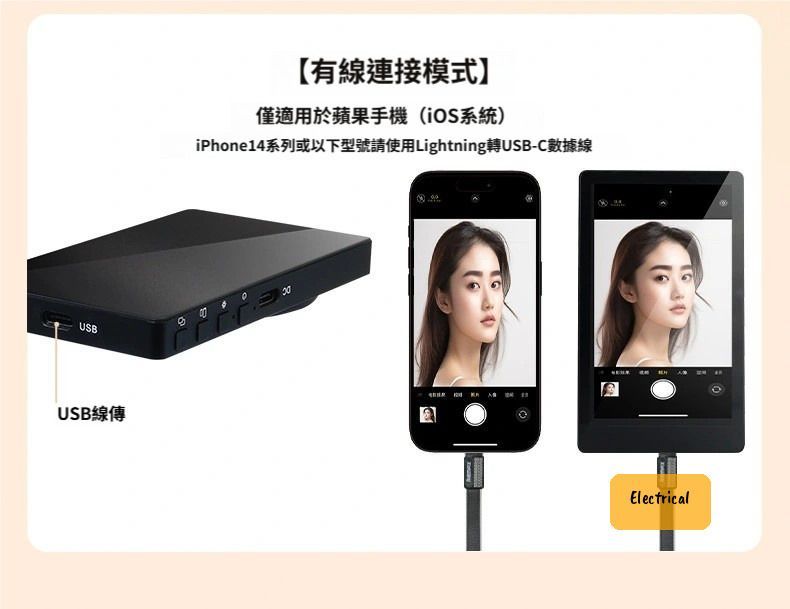 - 支援無線同有線連接(USB-C),專為iPhone(iOS系統)設計,使用Lightning轉USB-C線即可。