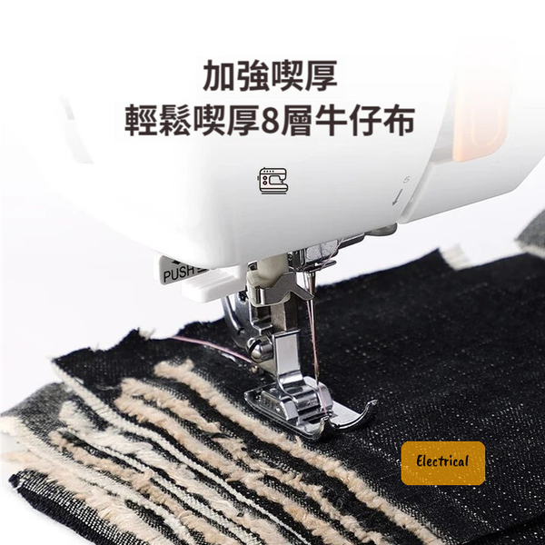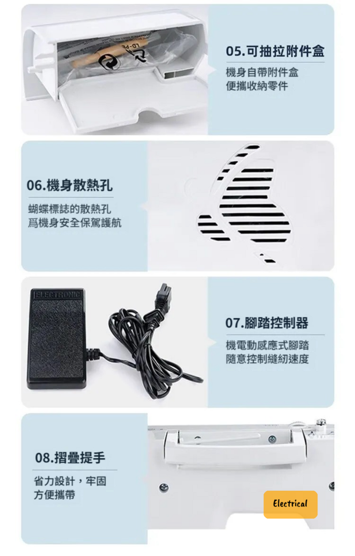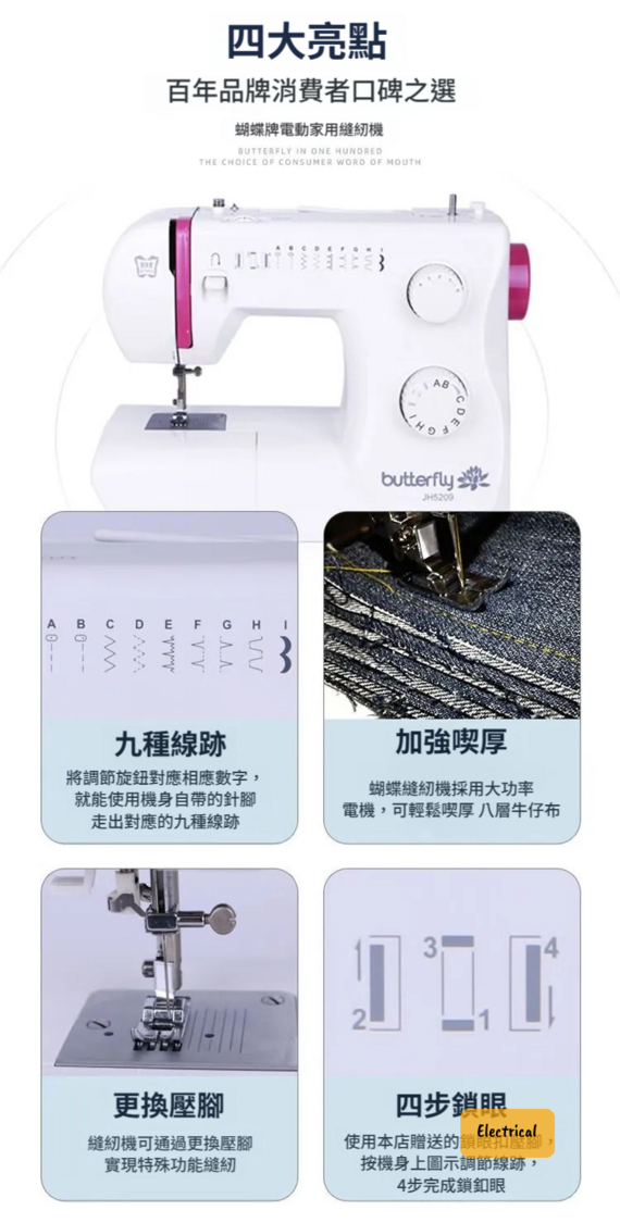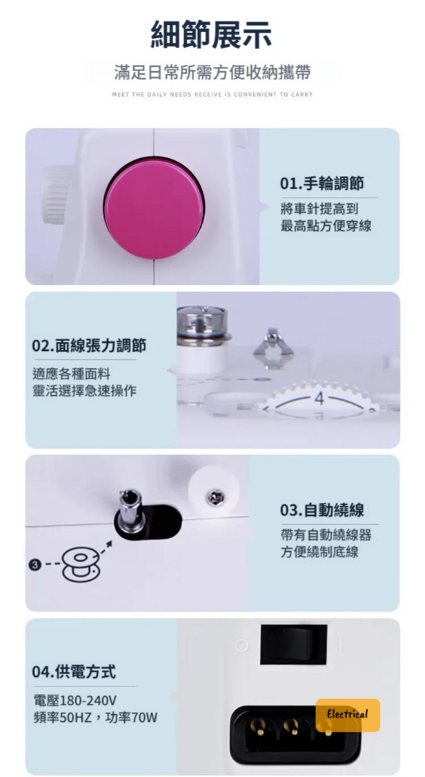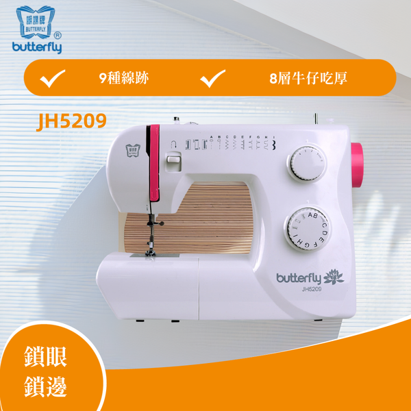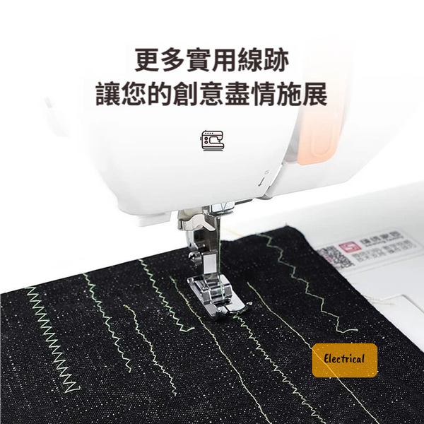 - 9種實用線跡,包括直線、曲折縫、鎖邊同鎖釦眼