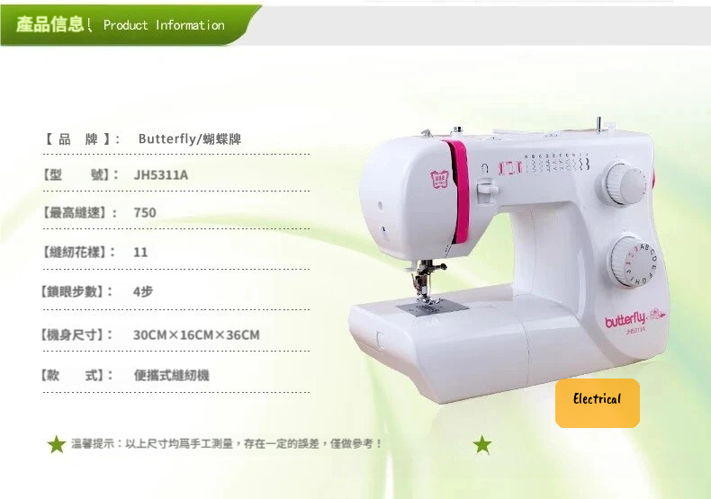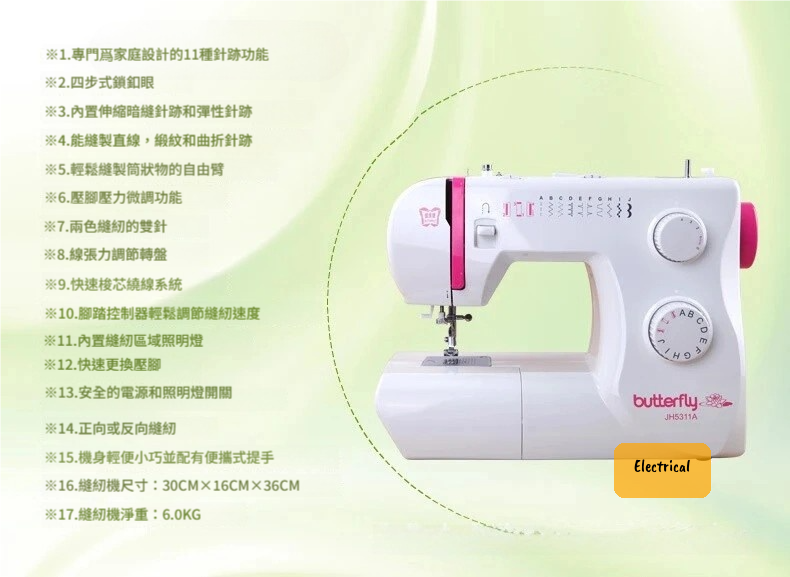 - 內置11種實用線跡,包括直線、曲折線同彈性線跡