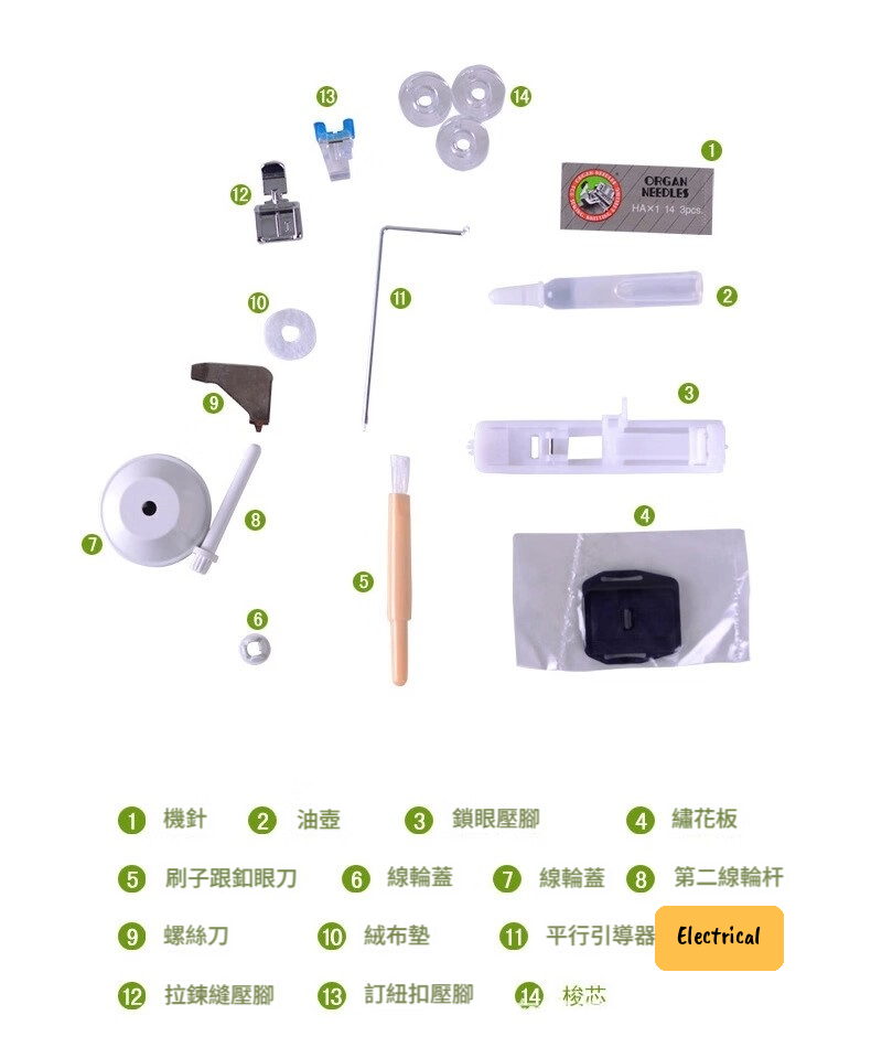 - 配件齊全:機針、油壺、鎖眼壓腳、繡花板、刷子、螺絲刀等