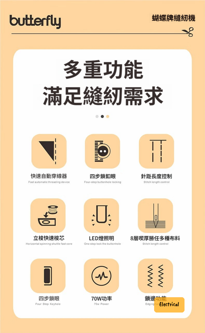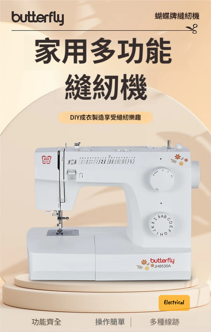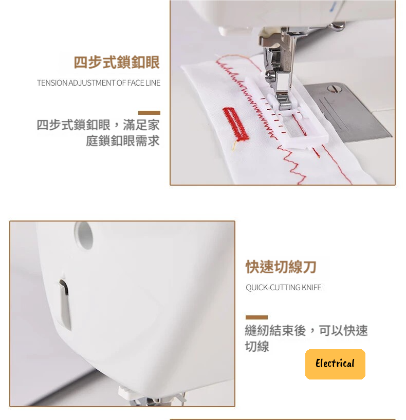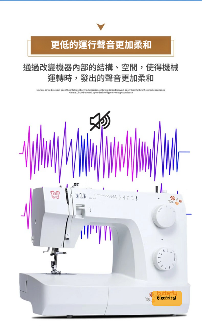 - 靜音運作技術:內部結構重新設計,比普通縫紉機靜30%,夜晚用都唔怕嘈住家人