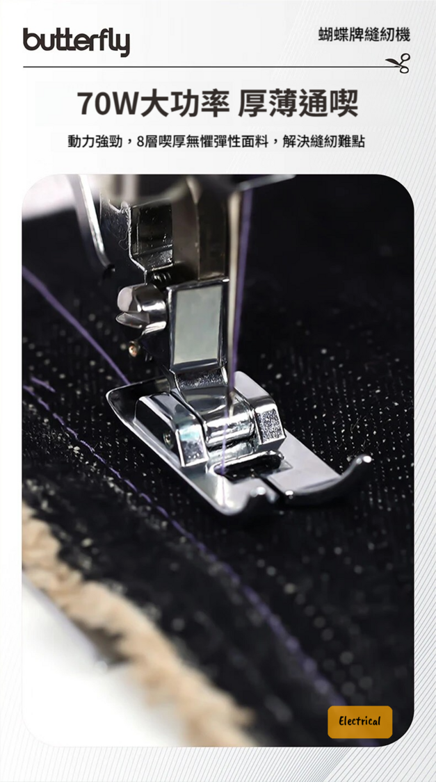 - 70W強勁馬力:最勁可以車到8層厚布,牛仔布、帆布、彈性布料統統搞得掂
