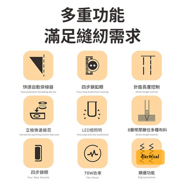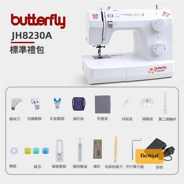 - 8種內置線跡:包括直線、鋸齒線、彈性線同裝飾線跡,滿足不同縫紉需求
