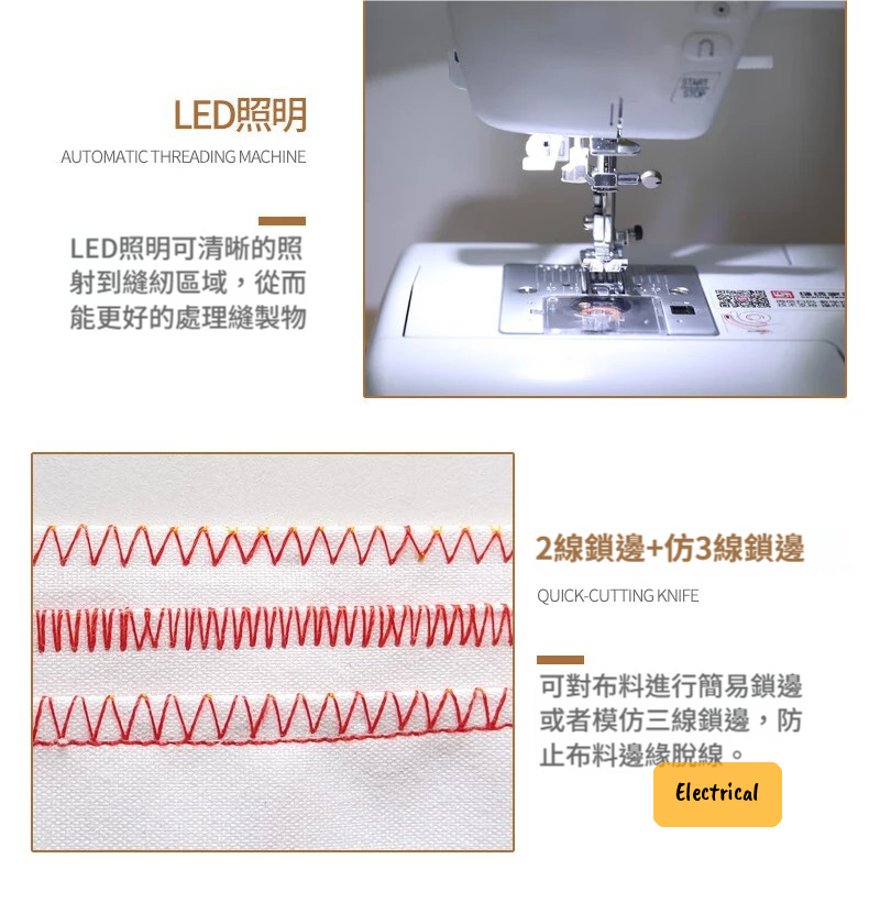 - LED工作區照明:光猛照明,就算光線不足都可以清楚睇到縫紉位置