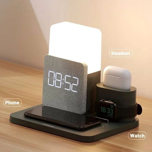 6功能合1 無線智能手機watch ipod充電 3色床頭小夜燈 時鐘鬧鐘