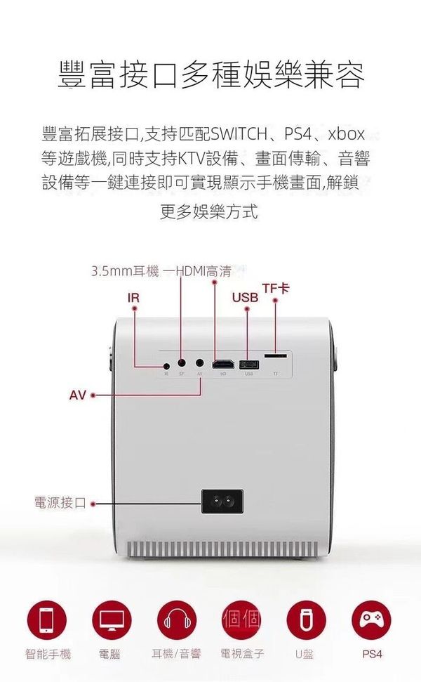 除了WIFI、藍牙、手機鏡像外,還配備HDMI、USB、3.5mm耳機介面、TF卡插槽、紅外線遙控!相容於市場上幾乎所有設備,如筆記型電腦、滑鼠、遊戲機、機上盒等